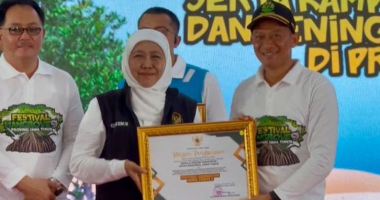 Pacitan - Kepala Perum Perhutani Divisi Regional Jawa Timur (Divre Jatim) menerima penghargaan atas komitmen dalam menjaga kelestarian kawasan hutan melalui pengelolaan hutan lestari, perlindungan tutupan hutan, serta penguatan fungsi ekologis hutan mangrove di Jawa Timur dari Pemerintah Provinsi Jatim pada acara Festival Mangrove ke-9 yang digelar di kawasan Watumejo Mangrove Park, Desa Kembang, Kecamatan Pacitan, Senin (22/12/2025).