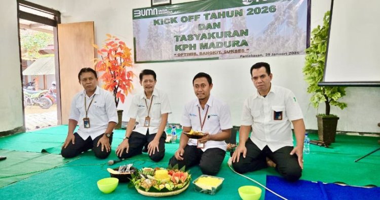 Madura (29/01/2026) - Perum Perhutani Kesatuan Pemangkuan Hutan (KPH) Madura menggelar Kick Off Tahun 2026 dan Tasyakuran. Kegiatan dipimpin langsung Oleh Administratur Perhutani KPH Madura Bima Andrayuwana, diikuti segenap jajaran manajemen dan karyawan bertempat di aula Simonget Kantor Perhutani KPH Madura pada Kamis, (29/01/2026).