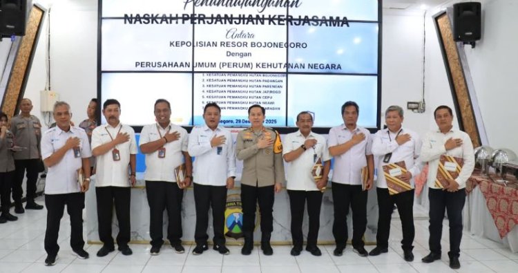 Padangan - Perhutani (29/12/2025) | Perhutani Kesatuan Pemangkuan Hutan (KPH) Padangan bersama tujuh KPH lainnya menandatangani perpanjangan Perjanjian Kerja Sama (PKS) dengan Kepolisian Resor (Polres) Bojonegoro terkait perlindungan hutan. Penandatanganan yang berlangsung di Markas Polres Bojonegoro ini disaksikan Kepala Perhutani Divisi Regional Jawa Timur pada Senin (29/12/2025).