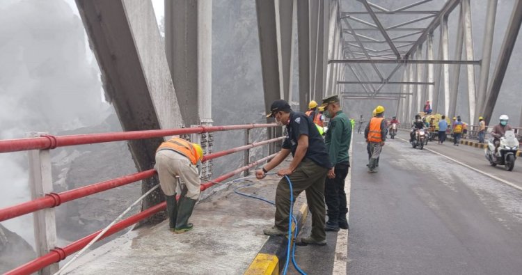 Probolinggo - Perum Perhutani Kesatuan Pemangkuan Hutan (KPH) Probolinggo, gerak cepat membersihkan Jembatan Gladak Perak dari abu vulkanik erupsi Gunung Semeru, dengan menyemprotkan air di Jembatan Gladak Perak, Kecamatan Candipuro Kabupaten Lumajang, pada Sabtu (22/11/2025).