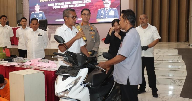 SURABAYA – Direktorat Reserse Kriminal Umum (Ditreskrimum) Polda Jawa Timur menyerahkan kembali satu unit sepeda motor Honda Beat hasil pengungkapan kasus pencurian kendaraan bermotor dalam Operasi Sikat Semeru 2025.