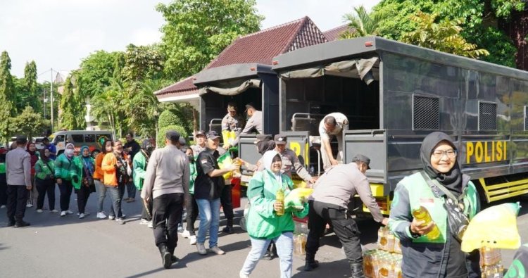 Pada kegiatan ini, Polda Jatim menyalurkan 1.050 paket beras SPHP masing-masing seberat 5 kilogram dan 1.000 liter minyak goreng merek Kita.